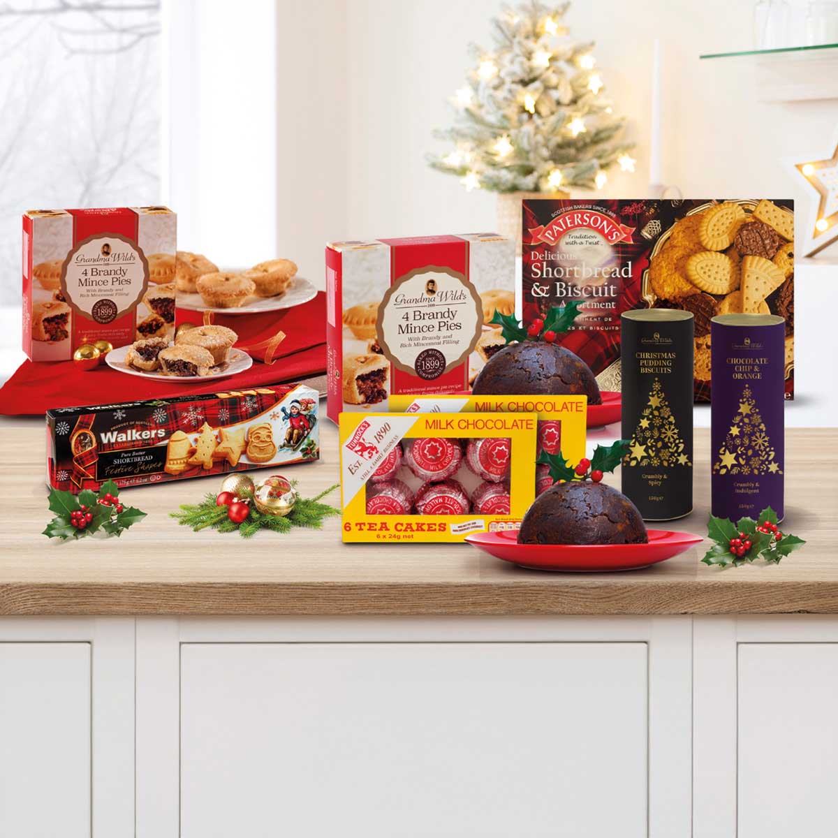 Contents:Patersons Shortbread & Biscuit Assortment Grandma Wilds Christmas Pudding Biscuits Grandma Wilds Mince Pie 4 pack x 2 Tunnocks Tea Cakes 6 pack x 2Walkers Shortbread 175gChristmas Pudding 400g x 2 Grandma Wilds Choc Chip & Orange Biscuits