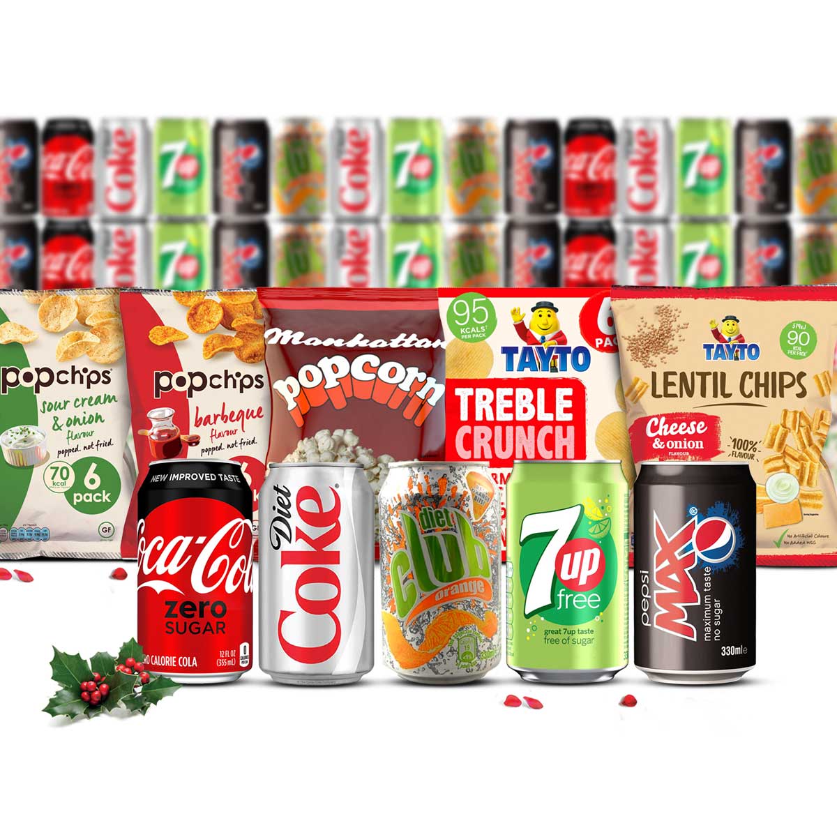 Contents:Diet 7up x 12Coke Zero x 6 Diet Coke 330ml x 10 Diet Club Orange 330ml x 12 Pepsi Max 330ml x 12Manhattan Popcorn 6 Pack Tayto Lentil Cheese & Onion 6 PackTayto Treble Crunch Cheese & Onion Popchips BBQ 5 Pack Popchips Sour Cream & Onion 5 Pack