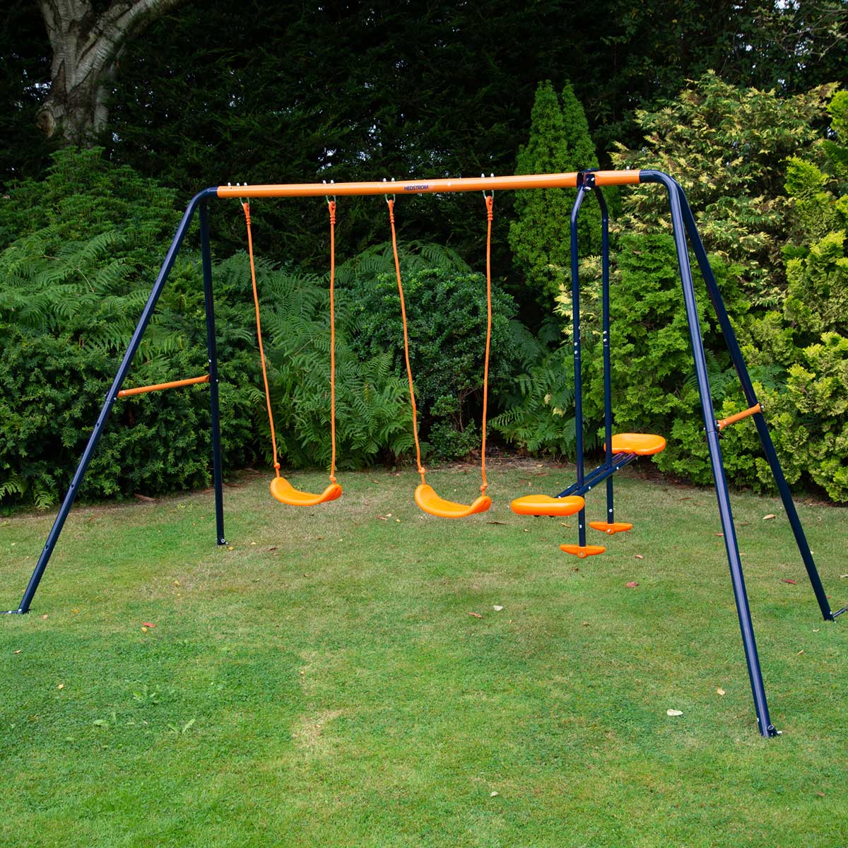 Built dimensions 180 x 320 x 156cm. Combined maximum user weight 145kg. Chunky blow-moulded seats. Adjustable ropes and ground pegs. Age 3+.
