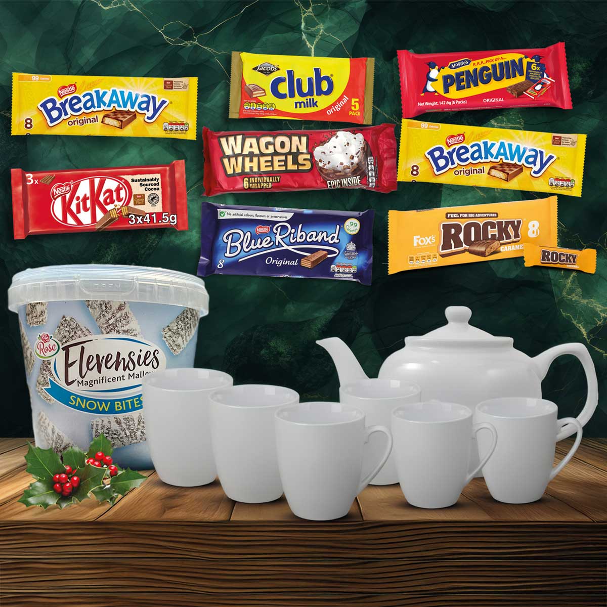 Contents:McVities Penguin Bar 6 PackNestle Breakaway 6 Pack x 2Blue Riband Original 8 PackFoxs Rocky Caramel 6 PackClub Milk 5 PackRose Elevensies Snow BitesWagon Wheel 6 PackNestle Kit Kat 4 Finger Snacksize 3 PackWhite Tea Pot with 6 with mugs